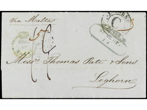 COLONIAS INGLESAS. 1851. ZANTE (Ionian Islands) a LIVORNO (Toscana, Italia) carta completa con texto, marca PAID/AT/ZANTE en verde y tarifa manuscrita "S" al dorso fechador de doble círculo de Malta y llegada, tasada con "12" décimas.