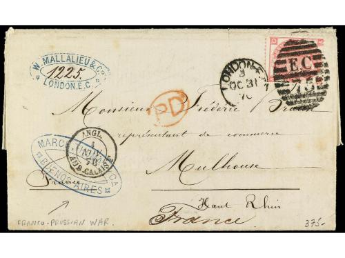 ARGENTINA. 1870. BUENOS AIRES a MULHOUSE. GUERRA FRANCO-PRUSIANA. Encaminada via Inglaterra marca del encaminador en el frente y allí franqueada con sello de 4 d. rosa para evitar el bloqueo de las tropas Prusianas de los puertos franceses.