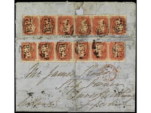 ARGENTINA. 1867. BUENOS AIRES a FRANCIA. Circulada con sellos británicos de 1 d. carmín (16), mat. de la B.P.O. B-32 de Buenos Aires, tránsito por Londres y llegada al dorso. Envuelta completa, sin las solapas laterales. Aunque presenta múltiples defectos por estar pegados los sellos a caballo entre anverso y reverso, el franqueo es excepcional.