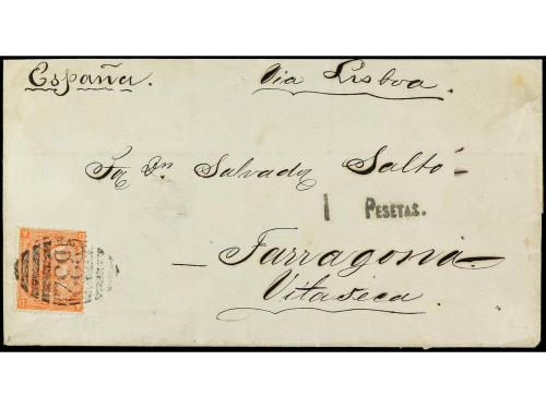 ARGENTINA. 1871. BUENOS AYRES a TARRAGONA. Circulada con sello británico de 4 d. naranja mat. B.P.O. B-32 de Buenos Aires, tasada a la llegada con 1 pta. circulada vía Lisboa, al dorso tránsitos y llegada. Rara tarifa de impresos a España.