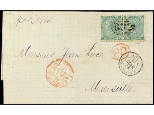 ARGENTINA. 1872. BUENOS AIRES a FRANCIA. Circulada con sellos británicos de 3 d. rosa y 4 d. naranja, mat. de la B.P.O. B-32 de Buenos Aires tránsito por Londres y llegada. Parte de la dirección reconstruida.