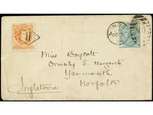 ARGENTINA. 1874. BUENOS AIRES a INGLATERRA. Circulada con sello argentino de 5 ctvos. naranja y sello británico de 1 sh. verde, mat. de la llegada con duplex LONDON / 460. Al dorso llegada.