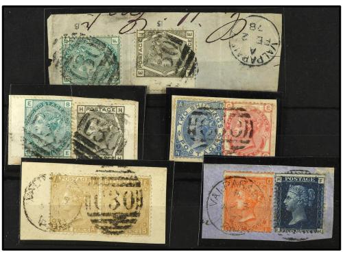 º Δ CHILE. 1865-80. Dos páginas de álbum con sellos británicos con matasellos C-30 de la B.P.O. de VALPARAÍSO y diversos sellos con nueve parejas, una tira de cuatro y cinco fragmentos (SG. +8.440 £).
