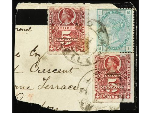 ✉ BOLIVIA. 1876. LA CHIMBA a INGLATERRA. Gran fragmento de carta con restauración, reconstruyendo la parte que falta. Circulada con sellos británicos de 1 sh.. verde (3) mat. ovalado CORREOS DE LA CHIMBA y marca ovalada de la B.P.O C-38 de Callao estampada en tránsito, al dorso tránsitos por Lima y Callao y llegada. A pesar de la importante restauración, PIEZA DE UNA GRAN RAREZA.