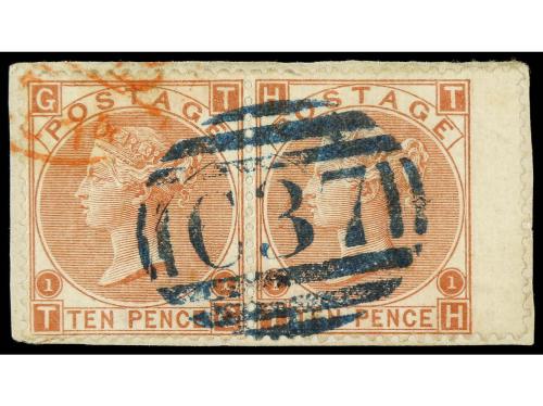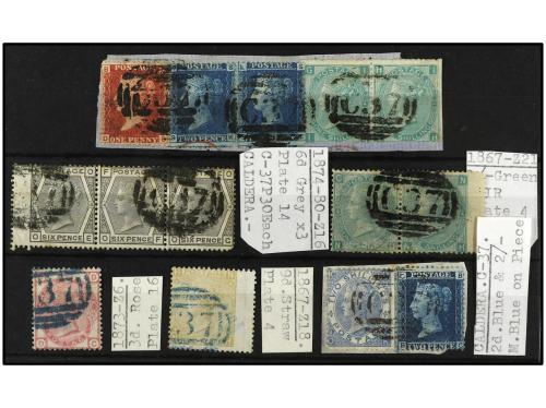 º Δ CHILE. 1865-80. Conjunto de sellos británicos con matasellos C-37 de la B.P.O de CALDERA incluyendo una pareja, tira de tres y dos fragmentos (SG. 1.690 £).