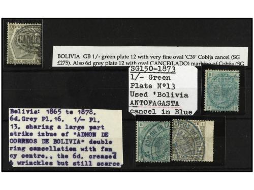 º BOLIVIA. 6 d. gris mat. CANCELADO de COBIJA. 1 sh. verde mat. ANTOFAGASTA y sellos de 6 d. + 1 sh. mat. circular ADMON. DE CORREOS DE BOLIVIA. RARO CONJUNTO.