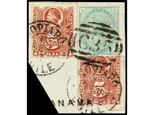 Δ CHILE. Fragmento con sello británico de 1 sh. verde matasellado en tránsito PANAMÁ y dos sellos de Chile de 5 ctvos. rojo, mat. COPIADO / CHILE. PRECIOSO y RARO.