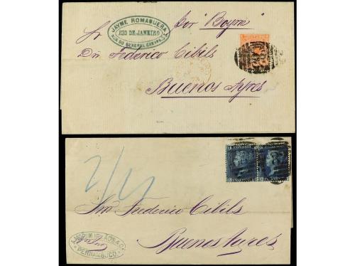 ✉ BRASIL. 1871-73. Dos cartas circuladas desde Rio de Janeiro y Pernambuco franqueadas con sellos británicos de 4 d. naranja y 2 + 2 d. azul con mat. de la B.P.O. C-83, C-82.