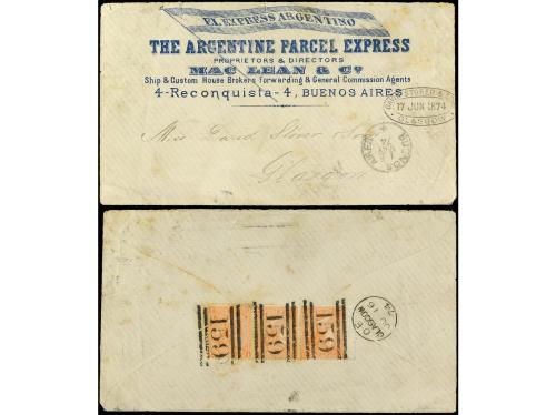 ✉ ARGENTINA. 1874. BUENOS AYRES a GLASGOW. Sobre de La Mensajería "EL EXPRESS ARGENTINO" circulada sin sellos probablemente por tener un acuerdo con el correo y pagar el porte argentino en metálico. Fechador de Buenos Aires, sellos británicos al dorso de 4 d. naranja (3) matasellados a la llegada tal como era preceptivo. Sensacional combinación de franqueo. Primer ejemplar que hemos visto.