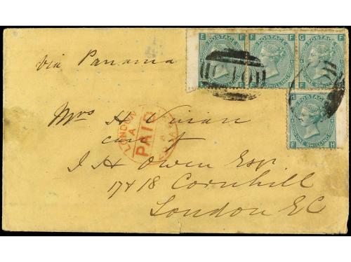 ✉ CHILE. 1869. COQUIMBO a LONDRES. Circulada con sellos británicos de 1 sh. verde (4) mat. de la B.P.O. C-40 de Coquimbo (fechador al dorso) llegada en el frente. MUY RARA.
