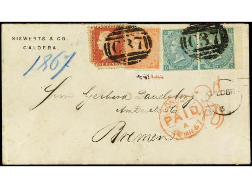 ✉ CHILE. 1867. CALDERA a BREMEN (Alemania). Circulada con sellos británicos de 1 d. rojo, 4 d. naranja y 1 sh. verde (2) mat. de la B.P.O. C-37 de Caldera. Defecto en el sello de 1d. pero muy raro franqueo, al dorso llegada.