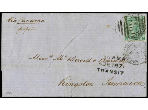 ✉ CHILE. 1871. VALPARAISO a KINGSTON (Jamaica). Circulada con sello británico de 1 sh. mat. de la B.P.O. C-30 de Valparaíso. Tránsito por Panamá y llegada al dorso. Rara destinación para una carta salida de Chile.