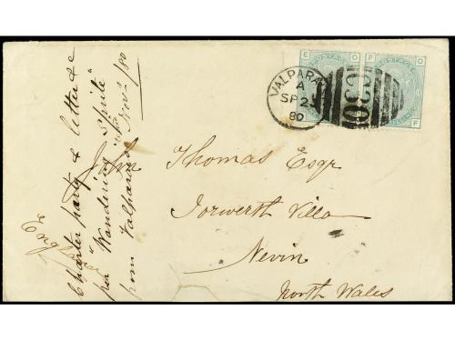 ✉ CHILE. 1880. VALPARAÍSO a GRAN BRETAÑA. Circulada con sellos británicos de 1 sh. verde (2) mat. de la B.P.O. C-30 de Valparaíso, falta la solapa inferior del dorso. Precioso franqueo.