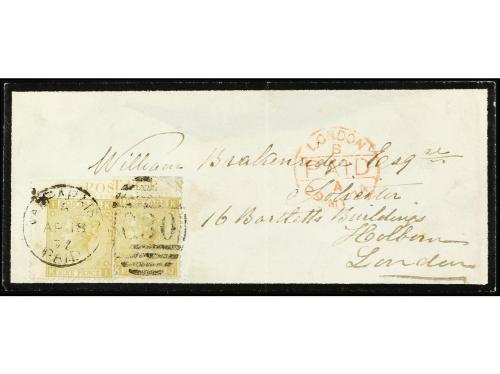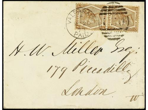 ✉ CHILE. 1874. VALPARAISO a LONDRES. Circulada con sellos británicos de 9 d. bistre (2) mat. duplex de la B.P.O. VALPARAÍSO / PAID / C-30, llegada en el frente. Falta una solapa al dorso. Muy raro franqueo con sellos de 9 d. Ex. col. CHARLES HAHN.