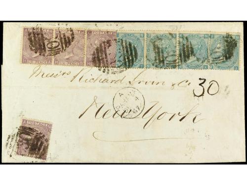 ✉ CHILE. 1867. VALPARAISO a NEW YORK. Circulado con sellos británicos de 6 d. violeta (4) y 1 sh. verde (4) mat. de la B.P.O. C-30 de Valparaíso, tránsito por Panamá. Muy rara combinación de franqueo.