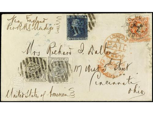 ✉ ARGENTINA. 1876. BUENOS AIRES a CINCINATI (USA). Circulada con sello argentino de 5 ctvos. naranja y sellos británicos de 2 d. azul y 6 d. gris (2) con mat. parrilla con cifra 43 (Foreign Branch). Tránsitos de Londres, New York y llegada. MAGNÍFICA y MUY RARA cruzando el Altántico dos veces.
