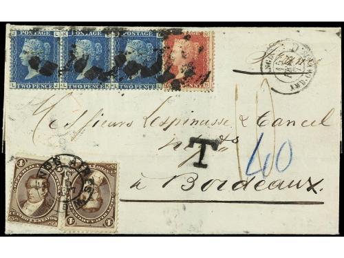 ✉ ARGENTINA. 1877. BUENOS AIRES a FRANCIA. Circulada con sellos de Argentina de 4 ctvos. castaño (2) y sellos de Gran Bretaña de 2 d. azul (3) y 1 d. rojo. matasellados en tránsito por Londres, tasada a la llegada con "10" décimas. MAGNÍFICA y MUY RARA.