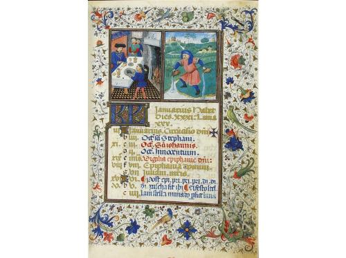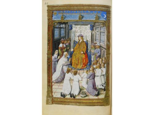 2020. LIBRO. (FACSÍMIL). LIBRO DE HORAS DEL DELFÍN DE FRANCIA. Bilbao: Ediciones de Arte y Bibliofilia, 2020. 8º mayor. Reproducción del original que se custodia en la Bibliothèque de Grenoble, bajo la signatura Ms. 1011. Reproduce fielmente el calendario, las miniaturas y texto del original. Enc. en terciopelo, con escudo metálico sobrepuesto en el plano anterior, presentado en un elegante estuche de madera lacada. Con acta notarial que indica que la tirada total es de 400 ejemplares. Sin el libro de estudio.