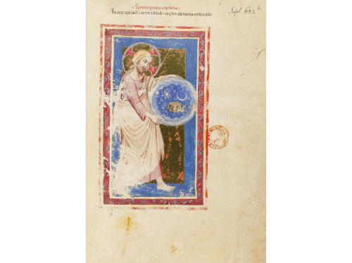 2006. LIBRO. (FACSÍMIL). APOCALIPSIS 1313. Barcelona: Ed. Moleiro, 2006. 4º. Aprox. 80 hojas imitación pergamino con la reproducción facsimilar del original que se encuentra en la Bibliothèque Nationale de France, con la signatura Fr. 13096. Enc. en pergamino rígido. Presentado en un estuche de piel con ruedas doradas en los planos. Edición numerada, limitada a 987 ejemplares, con acta notarial. Se acompaña del libro de comentarios, de la mano de Marianne Berreyre y Marie-Thérèse Gousset.