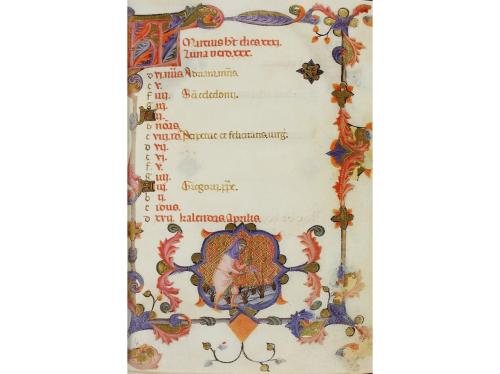 1996. LIBRO. (FACSÍMIL). LIBRO DE HORAS DE LA REINA MARIA DE NAVARRA. Barcelona: M. Moleiro Editor, 1996. 8º. Volumen del facsímil enc. en plena piel, nervios, florones, ruedas doradas en ambos planos, cortes dorados, ruedas doradas en las cejas, puntas ligeramente rozadas. Presentado en un elegante estuche en piel, con planos y lomera decorados con hierros dorados, e interior de seda. Edición numerada de 987 ejemplares, con certificado notarial. El Libro de horas de María de Navarra fue confeccionado en la época de florecimiento y desarrollo de este tipo de literatura, cuya difusión se vio impulsada por el deseo de los seglares de poseer un libro de rezo. Se acompaña del libro de estudios.