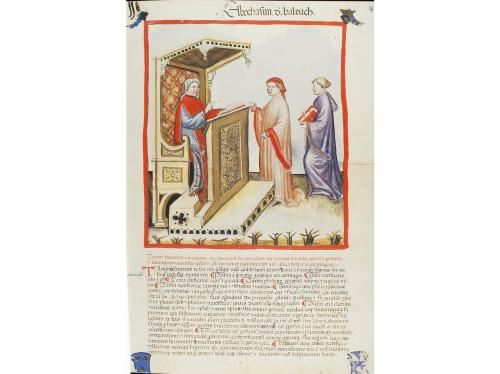 1998. LIBRO. (FACSÍMIL). TEATHRUM SANITATIS. Trad. de Anne Barton de Mayor. Barcelona: Moleiro, 1998. Folio menor. Abund. ilustr. Cada página con una ilustración en color. Enc. en piel con dorados y con estuche de piel (con alguna marquita) y el interior de seda. Edición de 987 ejemplares numerados. Certificado notarial de autenticidad. El Theatrum Sanitatis contiene un tratado médico muy difundido durante los siglos XIV y XV, destinado a divulgar entre los príncipes y los poderosos las normas higiénicas de la medicina racional (es decir, fruto de la experimentación, y no de las creencias mágico-religiosas) de la baja Edad Media. Este códice es un resumen de la traducción latina de finales del s. XI. Las ilustraciones se enmarcan dentro de la tradición artística lombarda, en la escuela de Giovanni de Grassi. Con el libro de estudio, en la caja original sin abrir pero ligero olor a humedad.