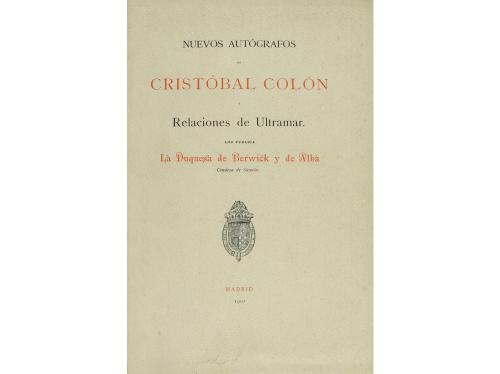 1892-1902. LIBRO. (FACSÍMIL-COLÓN). AUTOGRAFOS DE CRISTOBAL COLON Y PAPELES DE AMERICA. Madrid: Tip. Sucesores de Rivadeneyra, 1892. Folio menor. 2 h. + V +203 p. + 1 h. y 11 lám. (algunas plegadas). Rústica editorial, intonso. Lomera quebrada. [Más:] ID. NUEVOS AUTOGRAFOS DE CRISTOBAL COLON Y RELACIONES DE ULTRAMAR. Madrid: Suc. de Rivadeneyra, 1902. 4º mayor. 294 p.+ 2 h. 5 láms. Rústica editorial, lomera quebrada.