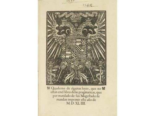 1544. FOLLETOS. (DERECHO). QUADERNO DE ALGUNAS LEYES, QUE NO ESTAN EN EL LIBRO DELAS PRAGMATICAS, QUE POR MANDADO DE SUS MAGESTADES SE MANDAN IMPRIMIR ESTE AÑO DE M.D.XLIIII. Salamanca: Imp. Joan de Canova, 16 de noviembre de 1544. 4º mayor. 12 h., sin paginar ni foliar (sig. A12). Escudo imperial xilográfico en la portada. Tipografía gótica. Capitales xilográficas y apostillas marginales. Enc. en pergamino rígido reciente. No en CCPB.