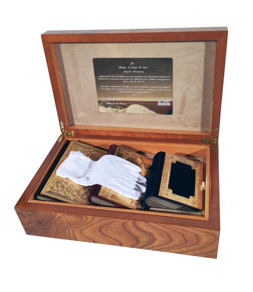 2014. LIBRO. (FACSÍMIL). TRÍPTICO DE MONTSERRAT. Salamanca: CM Editores, 2014. Se presentan juntos en un gran cofre de madera lacada tres facsímiles conservados en la Biblioteca de la Abadía de Motnserrat, con las signaturas Ms. 58, Ms. 66 y Ms. 851. Se trata del libro de Horas Munich-Montserrat, Libro de Horas de Ipolita Maria Sforza y el Liber Horarum Rothomagensis. Todos enc. en terciopelo con decoraciones doradas en ambos planos. El acta notarial está en una placa metálica que certifica que la tirada es de 400 ejemplares numerados, en la caja también se incluyen guantes de algodón.