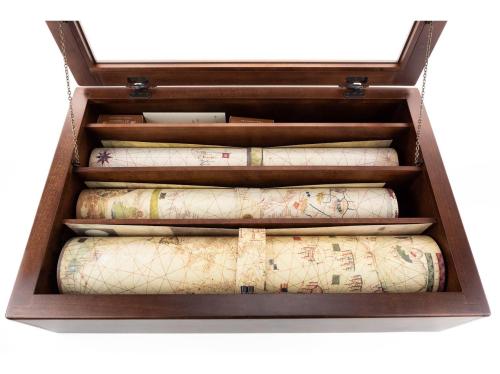 2004. LIBRO. (FACSÍMIL). COLLEZIONE DI PORTOLANI. Modena: Il Buino edizioni d'arte, 2004. Se presentan en facsímil tres portulanos conservados en la Biblioteca de la Universidad de Módena: portulano C.G.A.5.b (Mallorca, 1450 ca.), C.G.A.5.c (Portugal, 1472 ca.), C.G.A.5.d (Mallorca, 1450 ca.). Los tres presentados en una vitrina de madera y puerta de cristal junto con el acta que certifica una tirada de 499 ejemplares, una lupa y dos pesos con un medallón con la representación de los vientos.