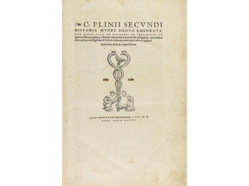 1535. LIBRO. (HISTORIA-CLÁSICOS). HISTORIA MUNDI, DENUO EMENDATA. Basileam: Apud inclytam Basileam, 1535. Folio. 16 h. + 671 p.+ 92 h. Texto a línea tirada con capitales xilográficas historiadas. Portada con marca tipográfica xilografiada. Ligera señal de óxido. Enc. en pergamino rígido, cortes pintados, tejuelo. CCPB 188718-1, describe un ejemplar incompleto.