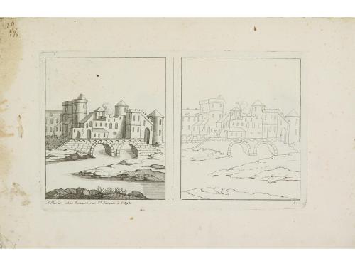 1670 ca. GRABADO. ÁLBUM. París: chés Bonnart, s.a. Folio menor apaisado. Contiene 20 grabados, realizados todos por Bonart con dos versiones del mismo grabado en cada página. Una vista simple y otra más compleja. Todas son vistas urbanas que en la versión simple busca sintetizar las formas geométricas de las construcciones y en la otra vista desarrolla más los volúmenes. Ha perdido la encuadernación, puntos de óxido. Unido por un hilo de cáñamo.