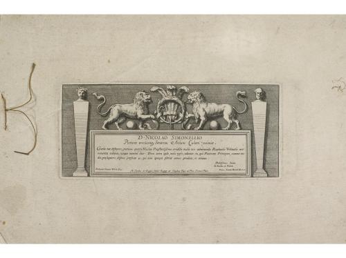 1680 ca. GRABADO. NICOLAO SIMOMELLIO. PICTURAE OMNIUMQ[UE] BONARUM. Roma: Iacobus de Rubeis., s.a. 15 grabados en álbum sin encuadernar, de folio mayor apaisado. Todos de temática bíblica relatan diferentes escenas del antiguo y nuevo testamento. Grabados basados en dibujos de Rafael de Urbino. Sin encuadernar, algo sucio el primero, con todos sus márgenes en buen papel de hilo de época.