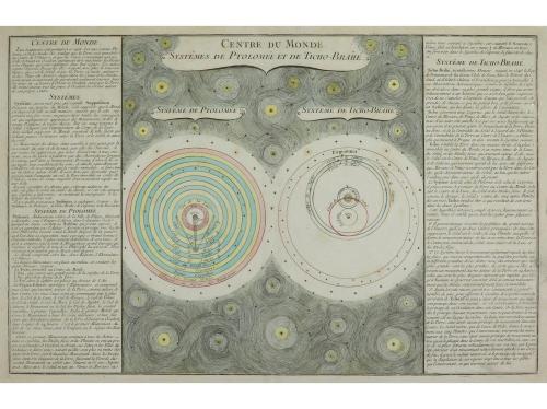 1761. GRABADO. (ASTRONOMÍA). [ATLAS METHODIQUE ET ELEMENTAIRE DE GEOGRAPHIE ET D'HISTOIRE...] SYSTÊME DE... Presentamos 3 grabados pertenecientes al Atlas Methodique... de Mornas. Todos sobre papel de época ligeramente azulado que representan los principales sistemas cosmológicos del sistema solar. El primero es Centre du Monde Systêmes de Ptolomée et de Ticho-Brahé, en ambos sistemas se propone la tierra en el centro y el resto de cuerpos celestes rotando a su alrededor, lleva el texto en plancha a cada lado explicando las dos posiciones. El segundo Systême de Copernic, donde el centro lo ocupa el sol. El tercero Systême de Descartes, donde el sol sigue siendo el centro, como en el sistema copernicano.