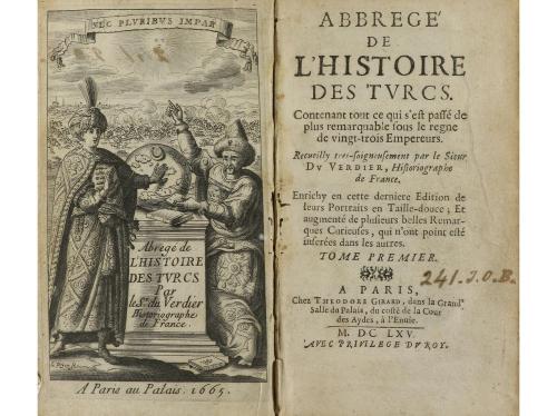 1665. LIBRO. (HISTORIA-TURQUÍA). ABBREGÉ DE L'HISTOIRE DES TURCS. CONTENANT TOUT CE QUI S'EST PASSÉ DE PLUS REMARQUABLE SOUS LE REGNE DE VINGT-TROIS EMPEREURS. Paris: Chez Theodore Girard, 1665. 2 vol. en 8º menor. I: 12 h., incluido frontis grabado + 556 p. + 12 h. Ilustr. con numerosos grabados en el texto. II: 2 h. (incluido frontis grabado) + 662 p. + 17 h. Ilustr. con numerosos grabados en el texto. 2 vol. enc. en plena piel, nervios, planos y lomeras muy rozados.