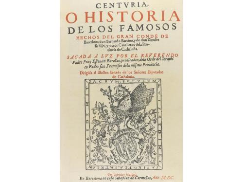 1600. LIBRO. (HISTORIA DE CATALUNYA). CENTURIA O HISTORIA DE LOS FAMOSOS HECHOS DEL GRAN CONDE DE BARCELONA DON BERNARDO BARCINO Y DE DON ZINOFRE SU HIJO, Y OTROS CAVALLEROS DE LA PROVINCIA DE CATALUÑA. Dirigida al Illustre Senado de los. Barcelona: Casa de Sebastian Comellas, 1600. 4º mayor. 22 hojas + 213 fol. (errores de foliación) + 7 h. Texto a dos columnas. Son facsímil 16 folios: *1, *2, *4, *5,* 8, A (todo el pliego), Dd1, Dd3 (signada como Dd5 por error), y la última con el escudo xilográfico. Papel débil, retauraciones marginales. Las cuatro h. de tablas con los márgenes muy cortos. Enc. firmada por Domenech en media piel. Muy rara obra de historias fabulosas sobre Catalunya y sus orígenes. Está considerado como uno de los últimos "libros de caballería". El autor indica en el prólogo que es fruto del estudio de un manuscrito escrito por el Rabino Capdevila, natural de la villa de Montblanc, una excusa para crear con esta obra una auténtica novela. Debido a su carácter de "literatura popular" siempre ha sido obra rara, Salvá (1531) tuvo un ejemplar defectuoso, Heredia lo describe corto de márgenes y con el grabado de la portada montado. Palau (24138) describe un ejemplar, vendido el año 1946 por 2000 ptas., compuesto de varios ejemplares y con facsímiles. Palau 24138. Salvá 1531.