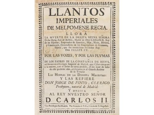 1696 ca. LIBRO. (EXEQUIAS). LLANTOS IMPERIALES DE MELPOMENE REGIA. LLORA LA MUERTE DE LA INCLITA REYNA SEÑORA DOÑA MARIA-ANA DE AUSTRIA, MADRE DE DON CARLOS II... Madrid: Antonio de Zafra, 1696 ca. 8º mayor. 8 h. + 134 p. En la fe de erratas y la tasa consta fecha 1696, año de la muerte de la reina. Portada en orla xilográfica. Texto con apostillas marginales. Enc. en pergamino de época, pequeña falta en el lomo. CCPB 38192-6.