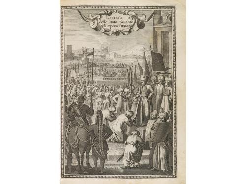 1673. LIBRO. (HISTORIA). ISTORIA DELLO STATO PRESENTE DELL'IMPERIO OTTOMANO. NELLA QUALE SI CONTENGONO... Venetia: Presso Combi & la Noù, 1673. 8º mayor. 8 h. icluido frontis grabado por S. Isabella + 296 p. Ilustr. con cabeceras y capitales xilográficas, incluye también grabados calcográficos en el texto. Sombra de óxido, algún cerco ocasional de humedad. Enc. en pergamino de época.