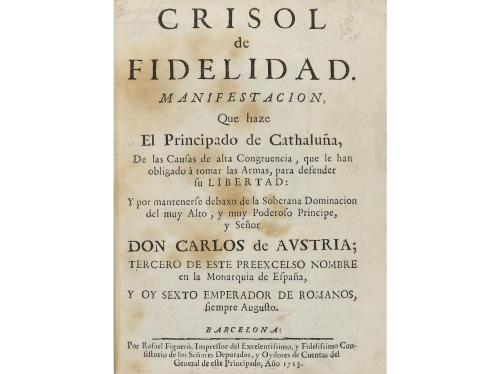 1713. LIBRO. (HISTORIA-CATALUNYA). CRISOL DE FIDELIDAD. MANIFESTACION, QUE HAZE EL PRINCIPADO DE CATHALUÑA, DE LAS CAUSAS DE ALTA CONGRUENCIA, QUE LE HAN OBLIGADO À TOMAR LAS ARMAS, PARA DEFENDER SU LIBERTAD: y por mantenerse debaxo de. Barcelona: Rafael Figuerò Impressor, 1713. 8º mayor. 60 p. Escudo xilográfico a modo de cabecera. Limpiado, leve sombra oleosa en las primeras hojas. Enc. en media piel, planos de cartoné papel al agua, por Domenech. Palau 64606. CCPB 1397521-8. En plena guerra de sucesión y a penas un año antes de la caída de Barcelona ante las tropas borbónicas, la Junta de Braços declaró la guerra a ultranza contra Felipe V y Luís XIV. Esta publicación pretende proclamar la adhesión del principado al candidato austracista y argumenta que no sólo lo hace por su libertad sino también por la de Aragón y Valencia, que ya estaban bajo el dominio de Felipe V.