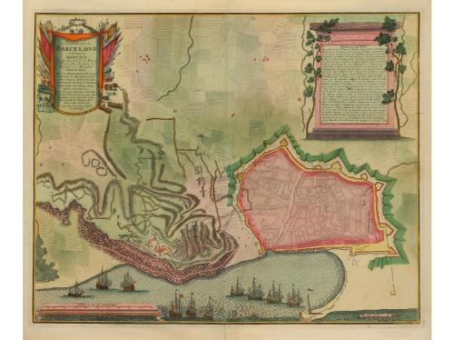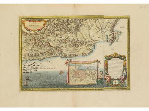 1698. GRABADO. (BARCELONA). PLAN DE SIEGE DE LA VILLE DE BARCELONE AVEC LA CARTE DE LA COTE DE LA MER DEPUIS LE CAP DE CERVERE JUSQU'AUX ENVIRONS DE LLOBREGAT. Paris: Chezz l'auteur. Bello mapa grabado al cobre y coloreado, huella 44,5 x 68,5 cm, sobrepuesto en papel de 64 x 94, en los márgenes marcas de lápiz. Corresponde a la vista oriental, que a partir de 1727 se publicó con orla propia. Soley 30.