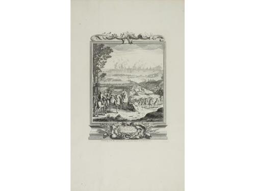 1720. GRABADO. (BARCELONA). DIE ANLÄNDUNG KÖNIGS CAROLI IN CATALONIEN, UND ERFOLGTER EINZUNG IN BARCELONA. Grabado al aguafuerte de 50 x 38 cm. Uno de los más bellos grabados relacionados con el puerto de Barcelona. Orla monumental de estilo rococó. Doblez horizontal y algún punto de óxido. Cat. Soley 167. [Junto con:] THE SIEGE OF BARCELONA TAKEN BY THE EARL OF PETERBOROUGH IN THE YEAR 1705. Published by Cl. du Bosch. Grabado de 26,5 x 19,5 cm y papel 46 x 28 cm. Soley, 217.