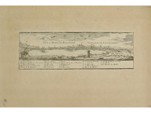 1690 ca. GRABADO. (BARCELONA). BARCELONE, VILLE CAPITALE DE LA PRINCIPAUTÉ DE CATALOGNE. Vista de Barcelona desde el mar, grabada al cobre. Plancha de 21 x 32 cm y papel 26,5 x 36,5 cm. Moteado de óxido. Soley 44B .