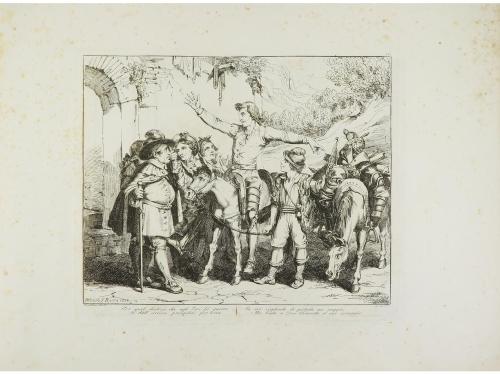 1834. GRABADO. (CERVATINA). GRABADOS DEL QUIJOTE. Volumen en gran folio apaisado que contiene 65 grabados de B. Pinelli basados en el Quijote. Bajo cada imagen dos líneas de texto, en plancha. Enc. en piel flexible de época, color tabaco, hilos dorados en ambos planos. Señal de óxido en toda la obra.
