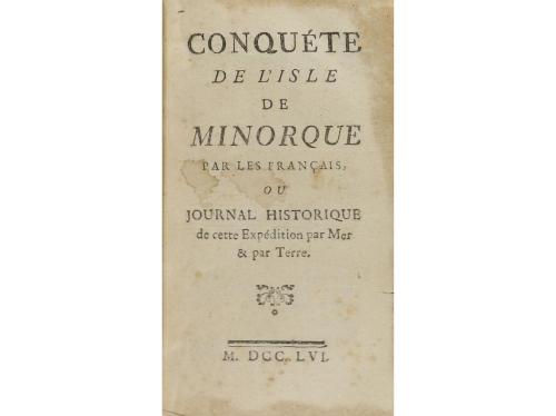 1756. LIBRO. (HISTORIA-MENORCA). CONQUÉTE DE L'ISLE DE MINORQUE PAR LE FRANÇAIS, OU JOURNAL HISTORIQUE DE CETTE EXPÉDITION PAR MER & PAR TERRE. S.l.: s.imp. 1756. 8º menor. 1 h. + VI + 180 p. Alguna manchita ocasional en bordes de página. [Sigue:] L'ECOLE DE L'ADMINISTRATION MARITIME OU LE MATELOT POLITIQUE. La Haye: Aux depens de l'autheur, s.a. XXII + 269 p. + 1 h. Enc. en pasta española, nervios, lomera cuajada. Detallada descripción contemporánea de la toma de Mahón (Menorca) y la rendición del Fuerte de San Felipe, considerado invencible hasta entonces. Al autor, anónimo, dedica la obra al pueblo de Marsella (quizás el lugar de publicación). Palau 59380. No en Barbier ni Bover.