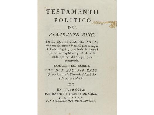 1780. LIBRO. (HISTORIA-MEMORIAS). TESTAMENTO POLITICO DEL ALMIRANTE BING: EN EL QUE SE MANIFIESTAN LAS MAXIMAS DEL PARTIDO REALISTA PARA SOJUZGAR AL PUEBLO INGLÉS, Y QUITARLE LA LIBERTAD QUE SE HA ADQUIRIDO... Valencia: Imp. Joseph y Thomas de Orga, 1780. 8º menor. 2 h. +272 p. Enc. en plena piel de época, dorados en la lomera, tejuelo. Leves rozaduras en el plano anterior y lomera. La administración inglesa quiso culpar de la pérdida de Menorca al Almirante Bing, al que jurzgó y ejecutó en Portmouth; esta ejecución hizo exclamar a Voltaire que "de vez en cuando hay que matar a un almirante para animar a los demás". Palau 29777.