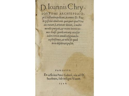1548. LIBRO. (CARTAS PAULINAS). IN OMNES D. PAULI ESPISTOLAS CO[M]ME[N]TARII.. Parisiis: Ex officina Petri Galteri, 1548. 8º menor. 8 h. + 444 h. Algún cerco de humedad antiguo. Enc. en pergamino de época, lomera rotulada y restos de cierres de badana, cortes tintados.