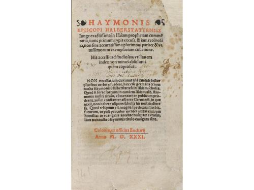 1531. LIBRO. (HUMANIDADES). LONGE EXACTISSIMA IN ISAIAM PROPHETAM COMM[N]TARIA, NUNC PRIMUM TYIPIS EXCUSA, & IAM RECE[N]S EDITA... Coloniae: Officina Eucharii, 1531. 8º menor. 11 h. (de 12, sin A8, traspuesta al final del volumen) + 562 p. + 1 h. con grabado xilográfico al verso. Restauración de una fina galería en el margen inferior de varias pp. Portada a dos tintas. [Sigue:] DE CHRISTIANUM RERUM MEMORIA LIBRI DECEM. 51 h. + 1 h. (es A8 que está traspuesta de la primera obra). Cercos de humedad en la esquina superior de la obra. Enc. en plena piel reciente, aunque conserva parte del antiguo plano anterior con hierros secos, cortes decorados a mano, de época.