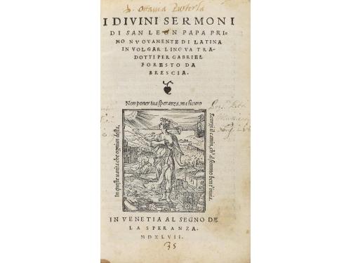 1547. LIBRO. (SERMONES). I DIVINI SERMONI DI SAN... DI LATINA IN VOLGAR LINGUA. Trad. Gabriel Foresto da Brescia. Venetia: Al Segno de la Speranza, 1547. 8º menor. 187 fol. + 3 h. Enc. reciente en media piel imitando antigua renacentista, hierros secos en ambos planos, nervios y hierros secos en lomera. Antiguas anotaciones manuscitas. Preciosa tipografía itálica. En el corte inferior manuscrito en caligrafía gótica "Serm. di S. Leone Papa X." .