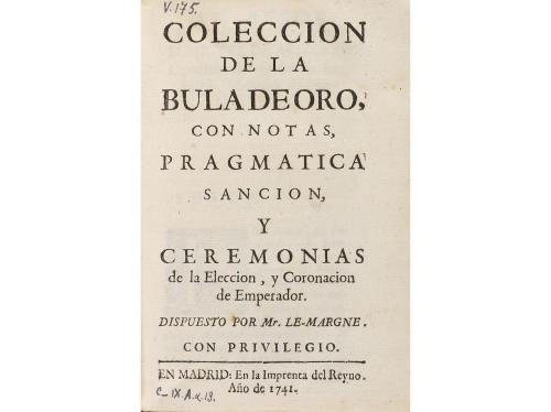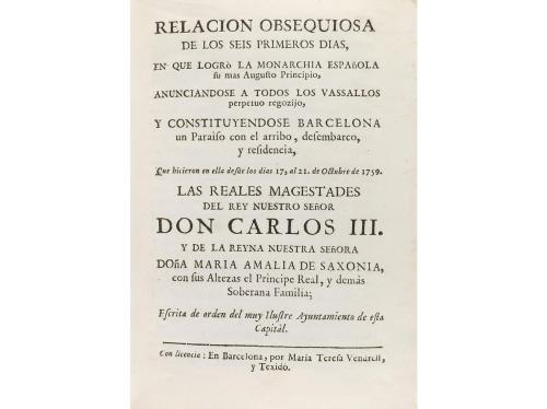 1759 ca. LIBRO. (MONARQUÍA). RELACION OBSEQUIOSA DE LOS SEIS PRIMEROS DIAS, EN QUE LOGRÓ LA MONARCHIA ESPAÑOLA SU MAS AUGUSTO PRINCIPIO, ANUNCIANDOSE A TODOS LOS VASSALLOS PERPETUO REGOZIJO... DON CARLOS III... Barcelona: Maria Teresa Vendrell y Teixido, s.a. 8º. 220 p. y 1 lám. plegada., grabada al cobre por Ignatius Valls. [Sigue:] CROSPIS, BERNARDO: DIOS GRACIOSO, Y GRATIFICADO POR LA CRUZ SERMON QUE EN ACCION DE GRACIAS... ARRIBO DE SUS MAGESTADES... 3 h.+ 30 p. Leve señal de óxido. Enc. en pergamino de época.