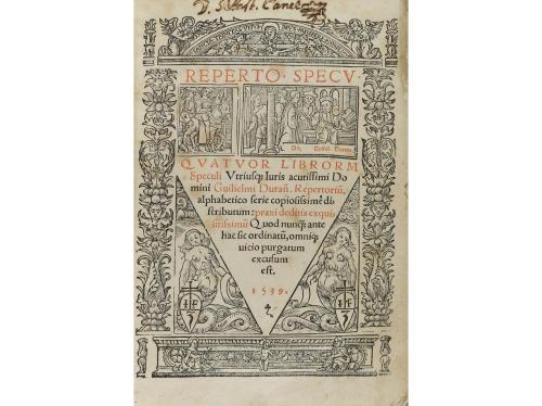 1539. LIBRO. (HUMANIDADES). REPERTORIU[M] ALPHABETICO SERIE COPIOSISSIME DISTRIBUTUM... PRIMA PARS. Lugduni: Imp. Tehobaldum paganus, 1539. 8º mayor. Repertorio: sin paginar sign. A8-M8-, N6 [Sigue] PRIMA PARS ESPEC. Id. 264 fol. tipografía gótica, con el texto enmarcado por los comentarios, a dos columnas. Dos portadas (una para el repertorio y otra para la primera parte), xilográficas y a dos tintas. Papel algo tostado, galerías marginales a lo largo de la obra. Enc. en pergamino de época, cortes pintados, un pliego suelto, pero completo.
