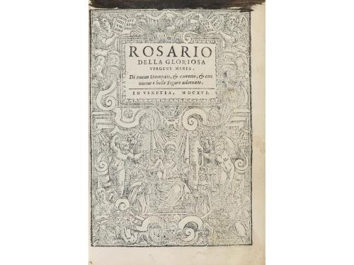 1616. LIBRO. (VIRGEN MARIA). ROSARIO DELLA GLORIOSA VERGINE MARIA. Venetia: Apresso Comino Gallina, 1616. 8º menor. 252 fol. + 4 h. Todas las hh. en orla xilográfica, portada xilográfica y numerosos grabados xilográficos a plena página. Mancha de tinta en el margen superior de la portada. Enc. en pergamino de época algo mareado.